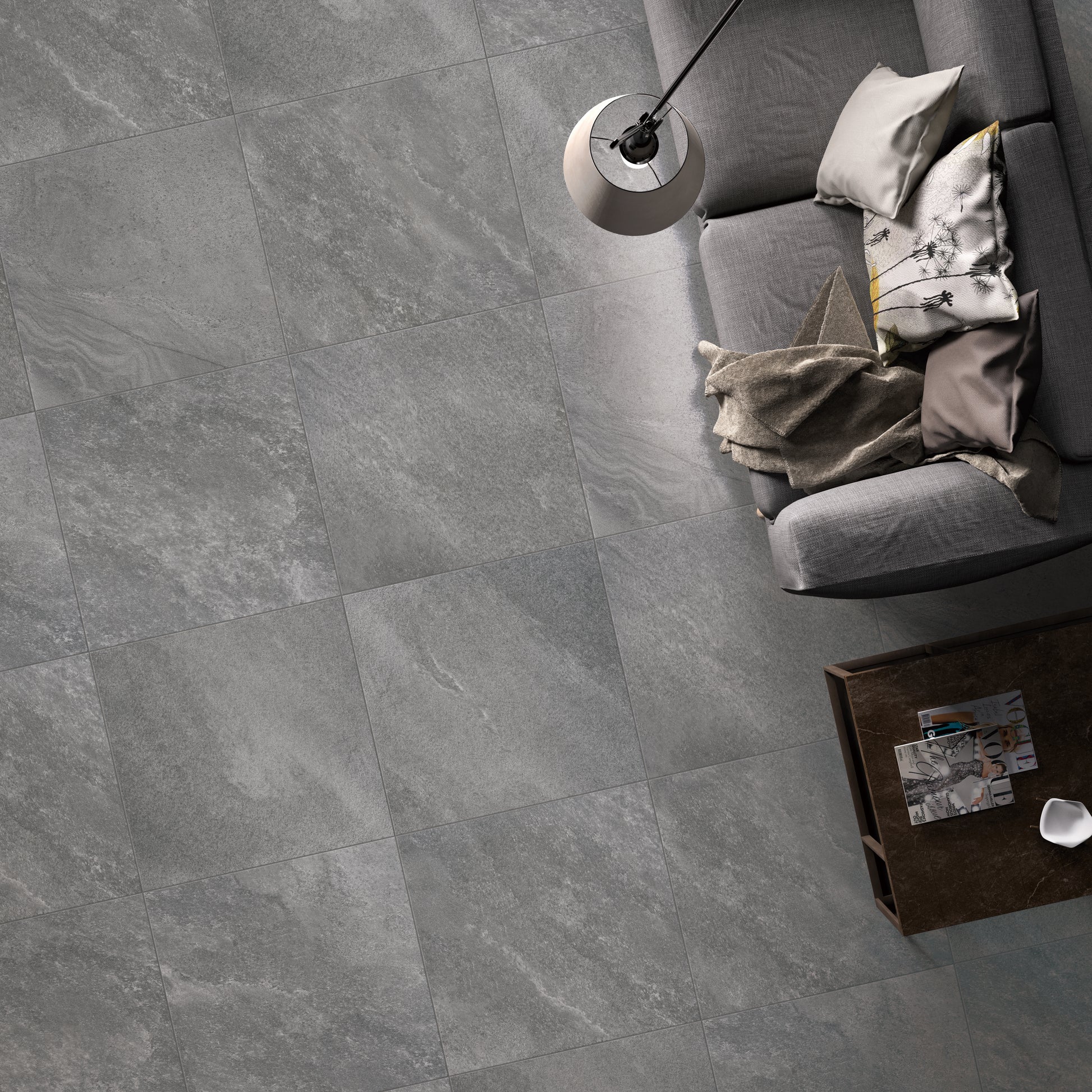 Shadestone Grey Porcelain Tile in a mid-grey stone-look finish is perfect for achieving a balanced modern stone aesthetic with durable performance for residential or commercial floors.